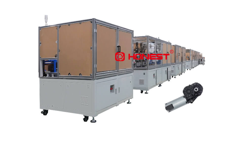The automobile seat recliner motor assembly line is mainly composed of a rubber cover section and a gearbox section, which are arranged in a straight line. The assembly process is monitored throughout, and a CCD visual system is configured for all-around inspection to improve production efficiency and stability. The conveying mechanism uses a flat belt carrier for transmission and is configured with a small amount of manual work and line inspection.