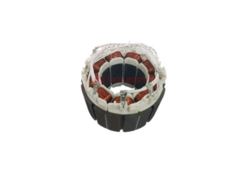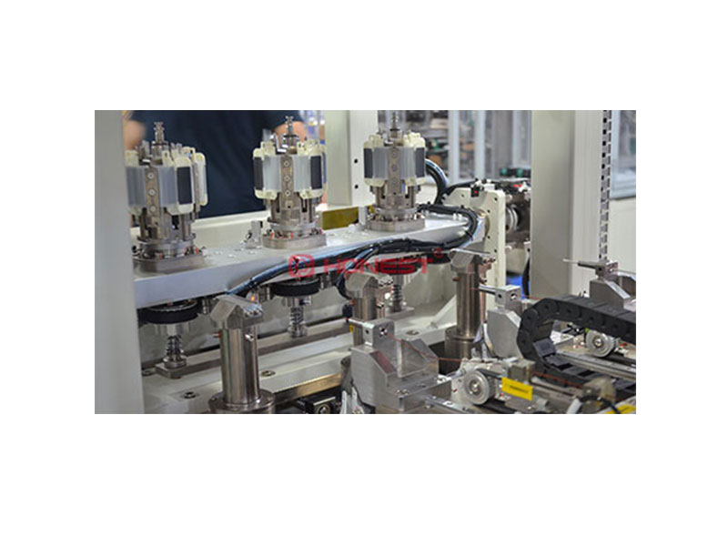 This equipment is an air conditioning compressor motor winding machine. The winding jig is supplied from the conveyor line pallet. The robot automatically grabs the winding jig for loading/unloading. It adopts the vertical core winding method and the three spindles perform winding simultaneously. During the winding process, each axis cooperates with each other to complete the wire arrangement and wire passing. When passing the wire, it is automatically pressed, and the end wire is automatically cut off. All three groups of wires can be identified and traced, and a servo tensioner is configured to control the winding. Wire tension (adjustable) provides stable tension control and tension monitoring during winding, and has a wire break alarm function. It is compatible with stator products with wire diameters of φ0.7-φ1.2mm. The equipment structure is flexible and modular. The unique design allows the equipment to realize stator winding with different wire diameters, stator outer diameters and stack thicknesses. It has a wide compatibility range, is convenient for model change, and is also conducive to later maintenance.