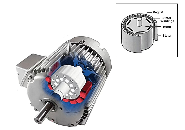 Instead of using windings, the rotor is equipped with permanent magnets to produce a rotating magnetic field. Since there is no DC power supply, this type of motor is straightforward and low-cost. It consists of a stator with 3 windings and a rotor with permanent magnets to produce magnetic field poles. It works by providing a three-phase input AC power supply to the stator.